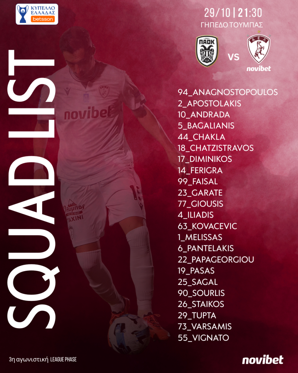 Ολοκληρώθηκε το μεσημέρι της Τρίτης (28/10) η προετοιμασία της ΑΕΛ Novibet για τον αγώνα Κυπέλλου με αντίπαλο τον ΠΑΟΚ στο Γήπεδο της Τούμπας για την 3η Αγωνιστική της Betsson League Phase του Κυπέλλου Ελλάδας (29/10, 21:30).