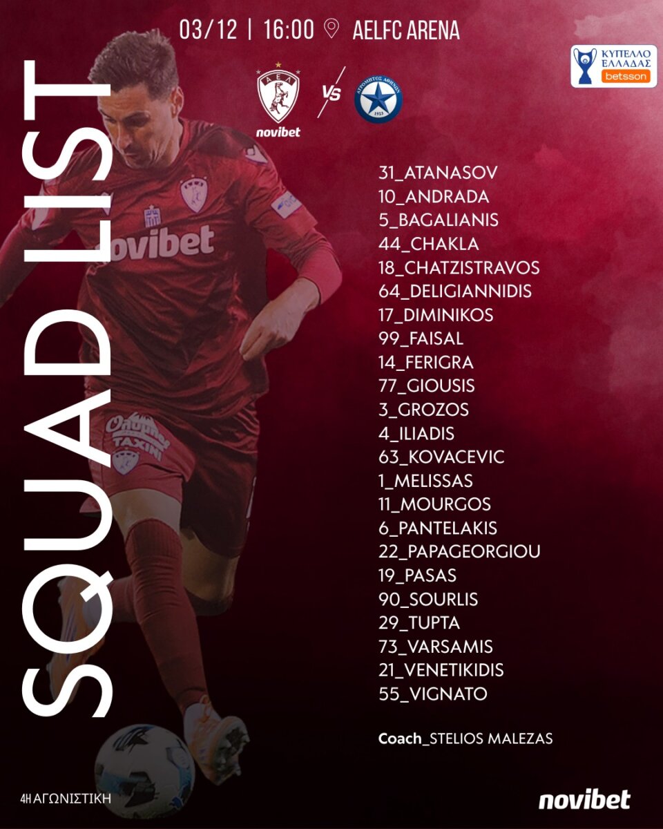 Ολοκληρώθηκε το μεσημέρι της Τρίτης (02/12) η προετοιμασία της ΑΕΛ Novibet για τον αγώνα Κυπέλλου με αντίπαλο τον Ατρόμητο στο AEL FC ARENA για την 4η Αγωνιστική της Betsson League Phase του Κυπέλλου Ελλάδας (03/12, 16:00).