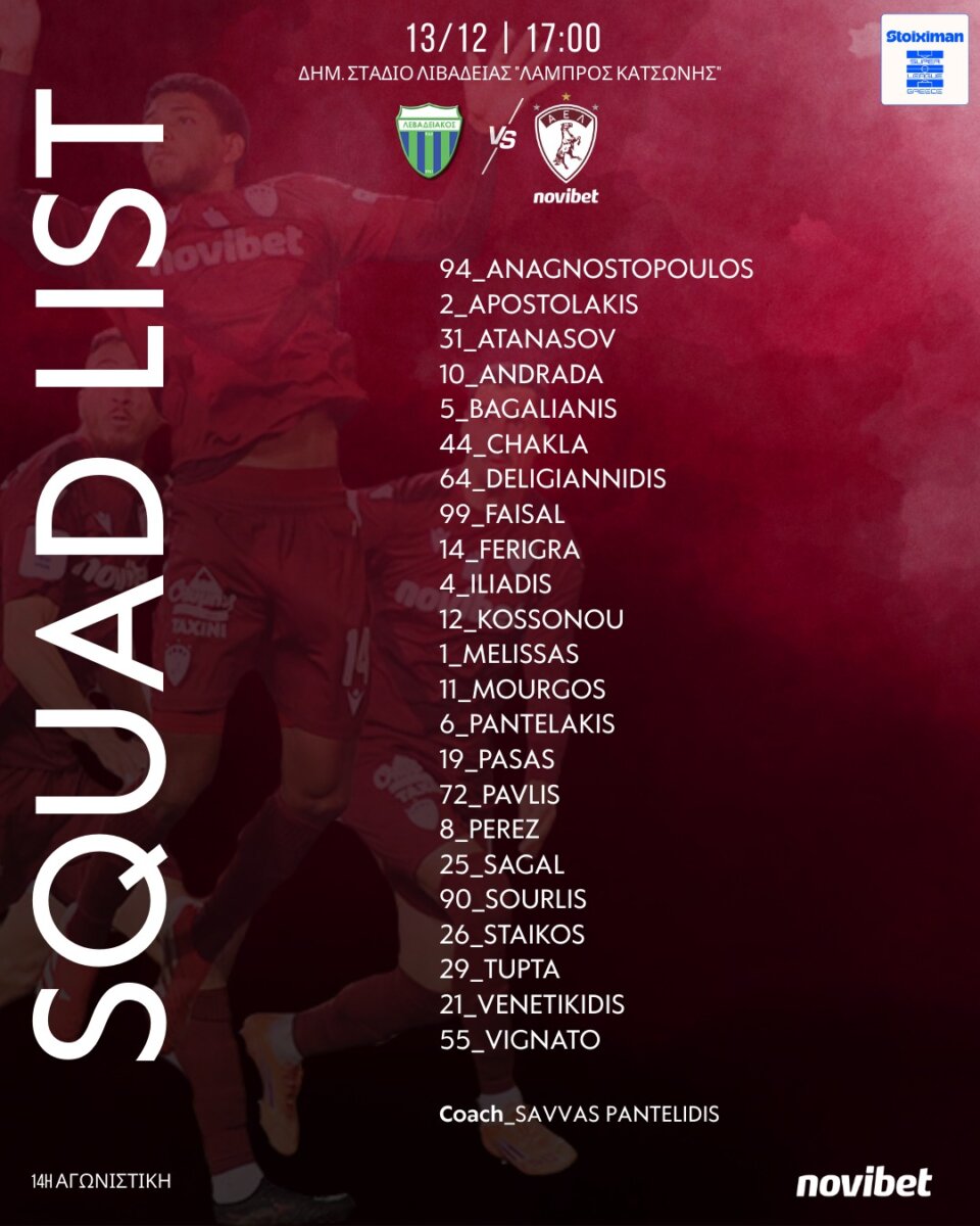Ολοκληρώθηκε το μεσημέρι της Παρασκευής (12/12) η προετοιμασία της ΑΕΛ Novibet για τον αγώνα Πρωταθλήματος με αντίπαλο τον Λεβαδειακό στη Λιβαδειά για την 14η Αγωνιστική της Stoiximan Super League (13/12, 17:00).