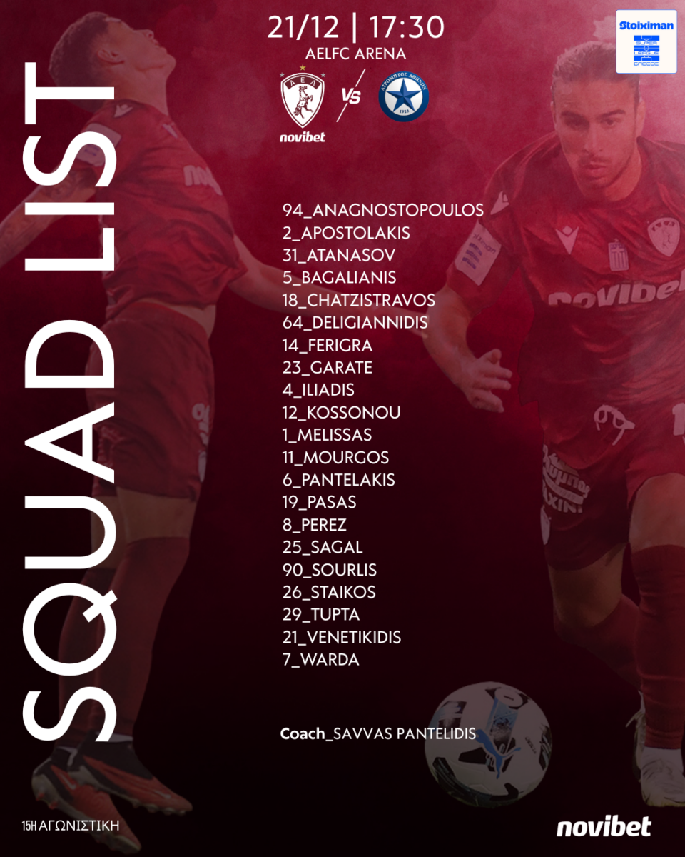 Οι 21 παίκτες που επέλεξε ο κ. Σάββας Παντελίδης είναι οι: Μελίσσας, Αναγνωστόπουλος, Βενετικίδης, Αποστολάκης, Φερίγκρα, Παντελάκης, Ηλιάδης, Μπαγκαλιάνης, Δεληγιαννίδης, Κοσονού, Στάικος, Σουρλής, Ατανάσοφ, Πέρεζ, Χατζηστραβός, Ουάρντα, Σαγάλ, Τούπτα, Γκαράτε, Μούργος και Πασάς.
