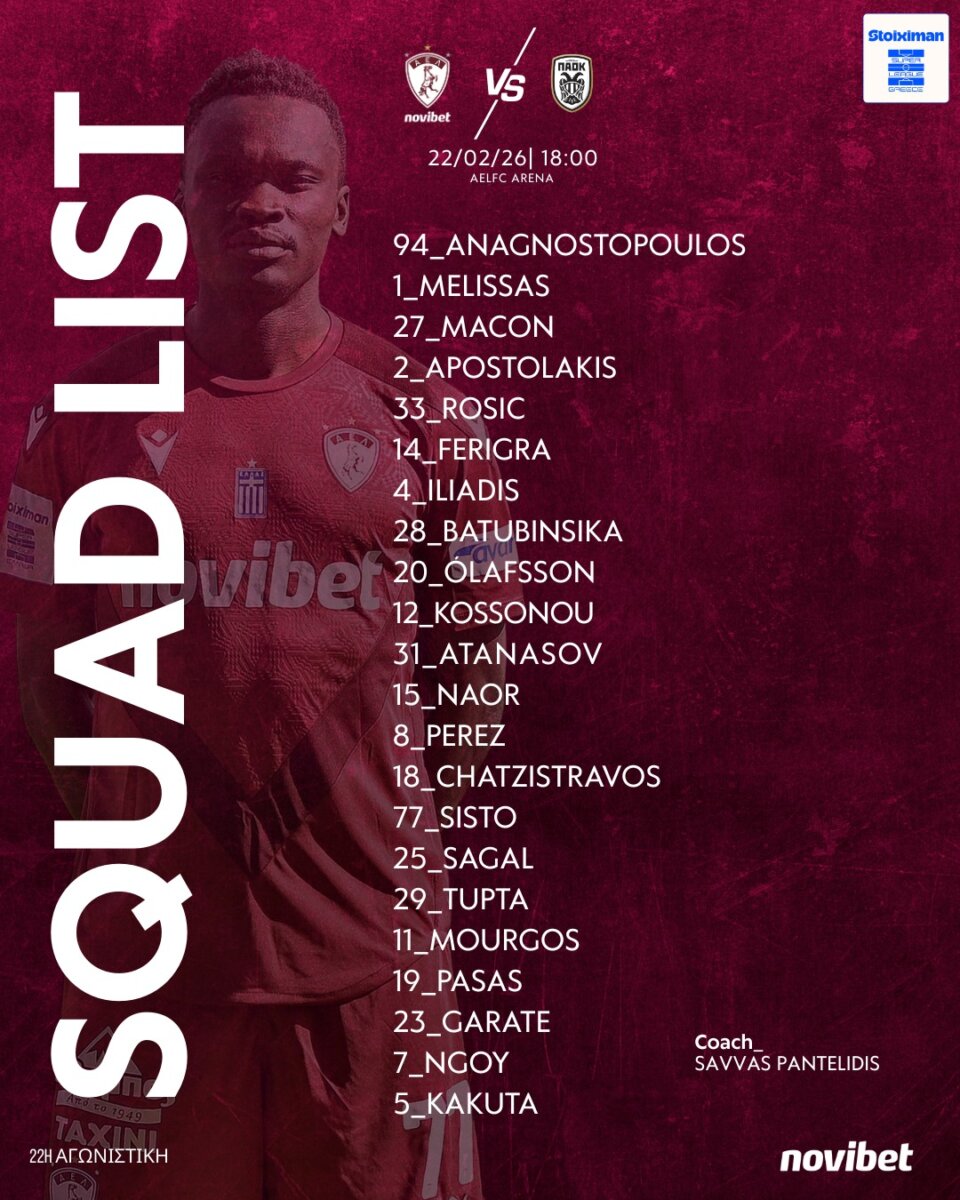 Οι 22 παίκτες που επίλεξε ο κ. Σάββας Παντελίδης είναι οι: Αναγνωστόπουλος, Μελίσσας, Μασόν, Αποστολάκης, Ρόσιτς Φερίγκρα, Ηλιάδης, Μπατουμπινσικά, Όλαφσον, Κοσονού, Σίστο, Ατανάσοφ, Ναόρ, Πέρεζ, Χατζηστραβός, Σαγάλ, Τούπτα, Μούργος, Πασάς, Γκαράτε, Ενγκόι, Κακουτά