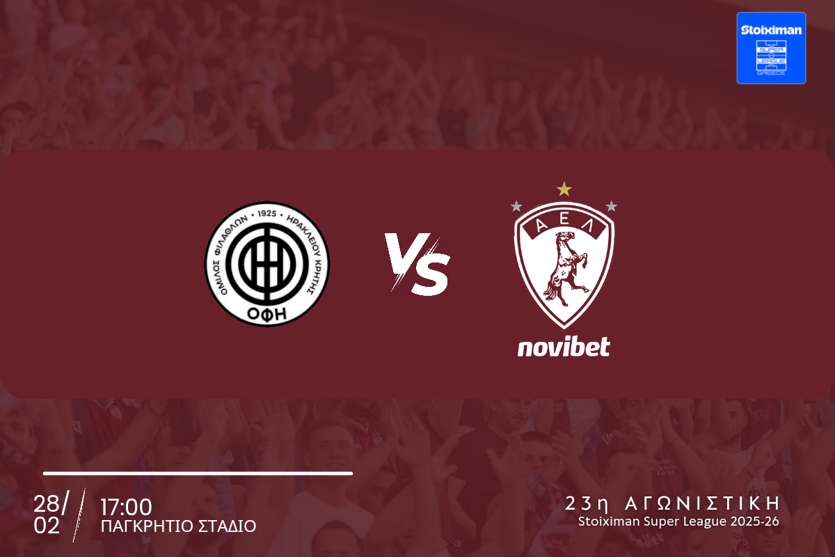 Σε συνέχεια της ενημέρωσης για τα εισιτήρια της αναμέτρησης της 23ης Αγωνιστικής της Stoiximan Super League μεταξύ ΠΑΕ ΟΦΗ 1925 – ΑΕΛ Novibet, η ΠΑΕ ΑΕΛ Novibet γνωστοποιεί στους φιλάθλους της ότι η διάθεση γίνεται αποκλειστικά ηλεκτρονικά μέσω του παρακάτω συνδέσμου και το κόστος ανέρχεται στα 20€ και αφορά την Θύρα 6 στο Παγκρήτιο Στάδιο το Σάββατο 28/02 στις 17:00: