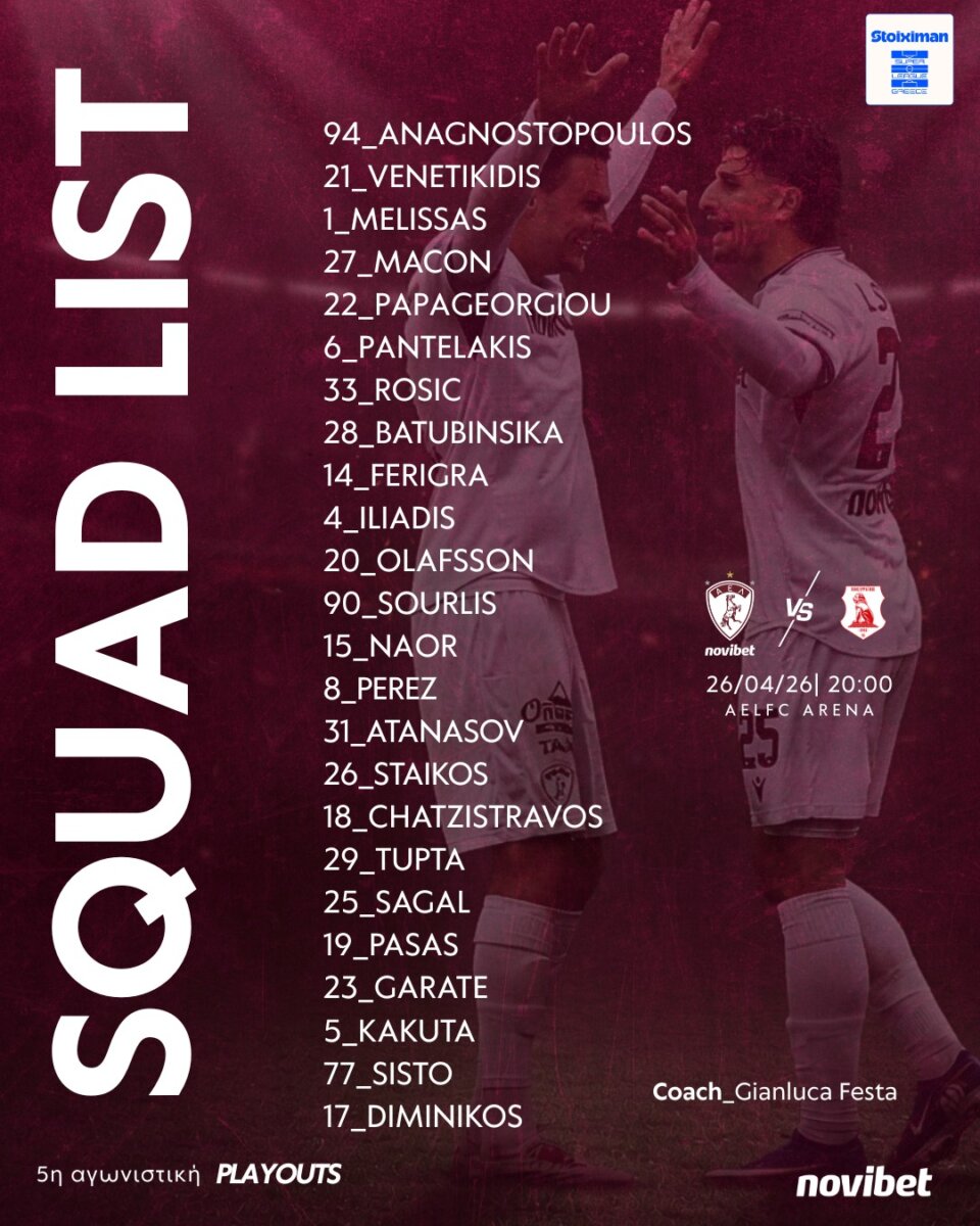 Ολοκληρώθηκε το απόγευμα του Σαββάτου (25/04) η προετοιμασία της ΑΕΛ Novibet για τον αγώνα με αντίπαλο τον Πανσερραϊκό στο AEL FC Arena για την 5η αγωνιστική των play outs της Stoiximan Super League(26/04,20:00).